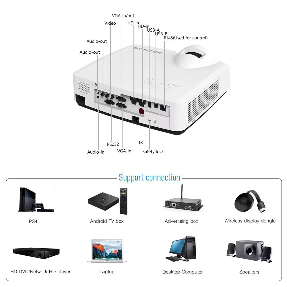مصدر الإضاءة LED يدوم حتى 10,000 ساعة في الوضع الاقتصادي، ما يضمن استخدامًا طويل الأمد مع تقليل تكاليف الصيانة. كما يدعم عدة منافذ إدخال مثل HDMI، VGA، فيديو، S-Video لتوافق سهل مع مختلف الأجهزة.